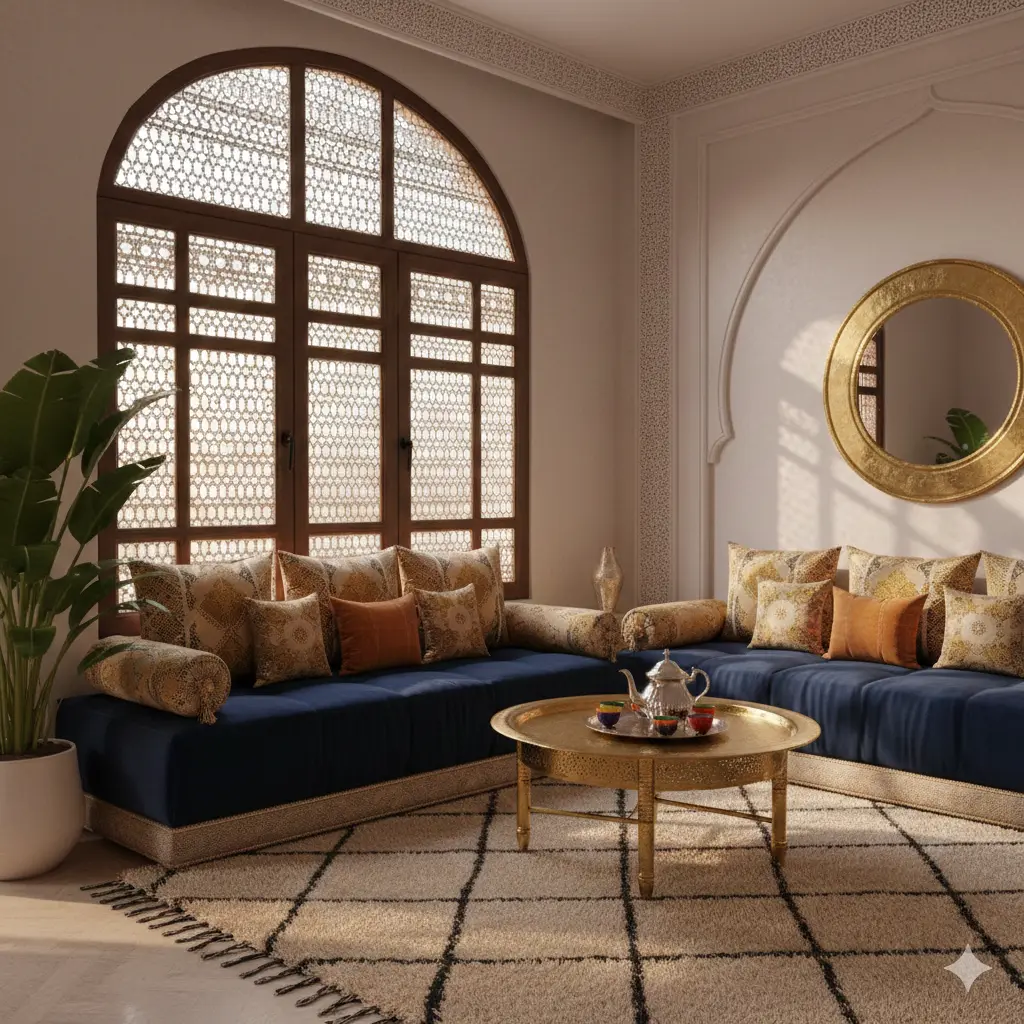 تعتبر المجلات العالمية للديكور أن السر في الصالونات المغربية الناجحة يكمن في “الطبقات”؛ أي قدرتك على دمج طبقة من الحرير في الستائر مع طبقة من الصوف في السجاد لخلق تباين ملمسي غني.