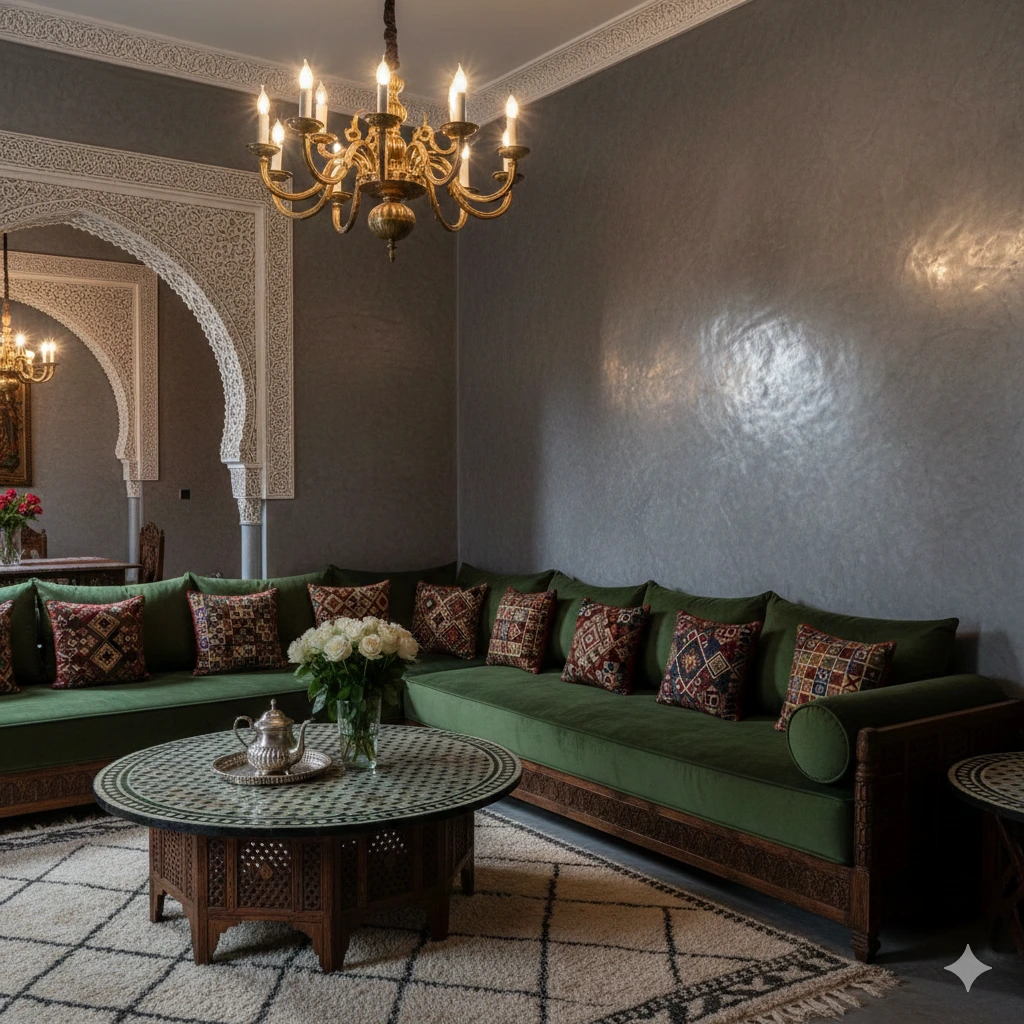 - الألوان الترابية (البيج، الكريمي، الرملي): هي الألوان الأكثر مبيعاً في المغرب. لماذا؟ لأنها تعطي شعوراً بالدفء والاتساع، وتليق تماماً مع جميع ألوان “اللمط” (أقمشة الأرائك) سواء كانت خضراء زمردية أو حمراء ملكية.