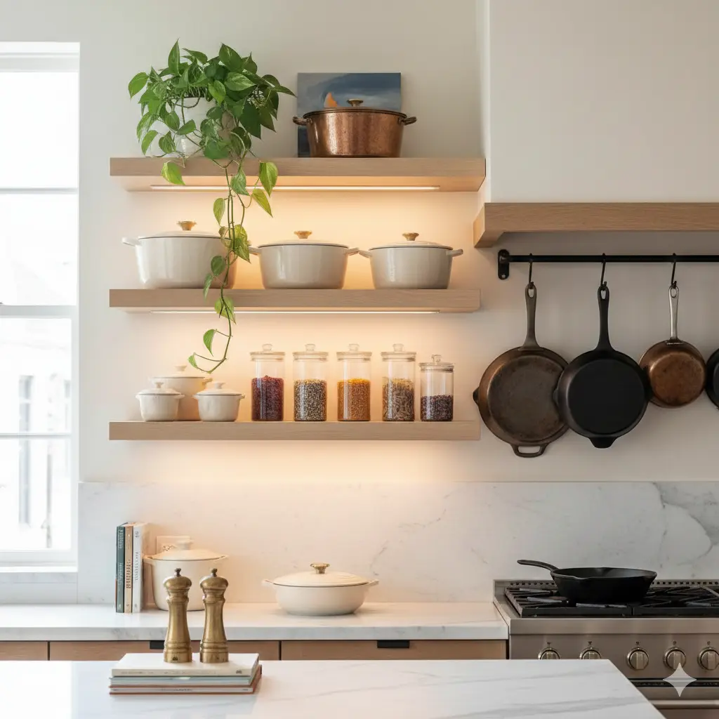 تذكر أن الرف المفتوح ليس مجرد مساحة للتخزين، بل هو مساحة للتعبير عن شخصيتك؛ لذا لا تتردد في إضافة قطعة ديكور غير مطبخية، مثل نبتة “البوتس” المتدلية أو لوحة فنية صغيرة مقاومة للرطوبة، لإضفاء روح الحيوية.