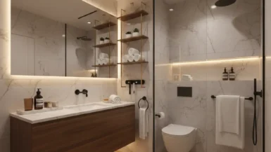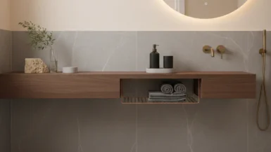 - الأبيض والسكني الفاتح: الخيار الكلاسيكي الذي يعزز الشعور بالنظافة والاتساع. ميزته الكبرى هي أنه يعكس أقصى قدر من الضوء، مما يقلل من ظهور بقع “التكلس” الناتجة عن بخار الماء.